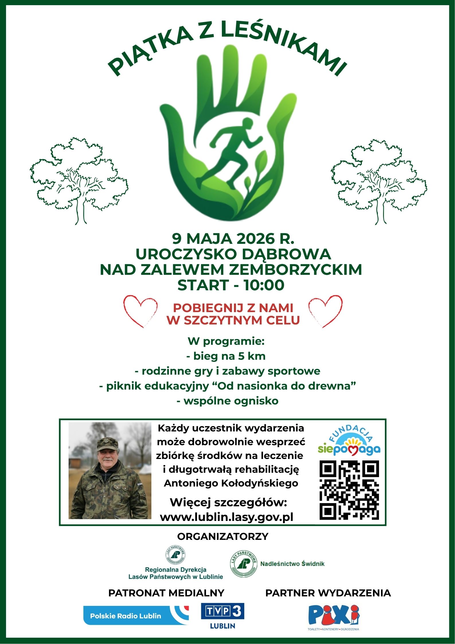 „Piątka z leśnikami” to coś więcej niż bieg. To spotkanie ludzi, którzy chcą spędzić czas aktywnie, w dobrej atmosferze i w bliskości otaczającej przyrody. Organizatorzy – Regionalna Dyrekcja Lasów Państwowych w Lublinie oraz Nadleśnictwo Świdnik – zapraszają wszystkich miłośników aktywności na łonie natury do udziału w wydarzeniu i do wspólnego przeżycia tego dnia w wyjątkowej przestrzeni Uroczyska Dąbrowa. –Gorąco zachęcam do udziału w „Piątce z leśnikami”. Spotkajmy się 9 maja w Uroczysku Dąbrowa, by wspólnie pobyć w lesie, aktywnie spędzić czas i pokazać, że potrafimy być razem wtedy, gdy chodzi o zdrowie, edukację i pomoc drugiemu człowiekowi. To wydarzenie otwarte dla każdego – przyjdźcie Państwo z rodziną, ze znajomymi, z dobrym nastawieniem. Do zobaczenia w lesie – zaprasza Dyrektor Regionalnej Dyrekcji Lasów Państwowych w Lublinie Jan Kowal.